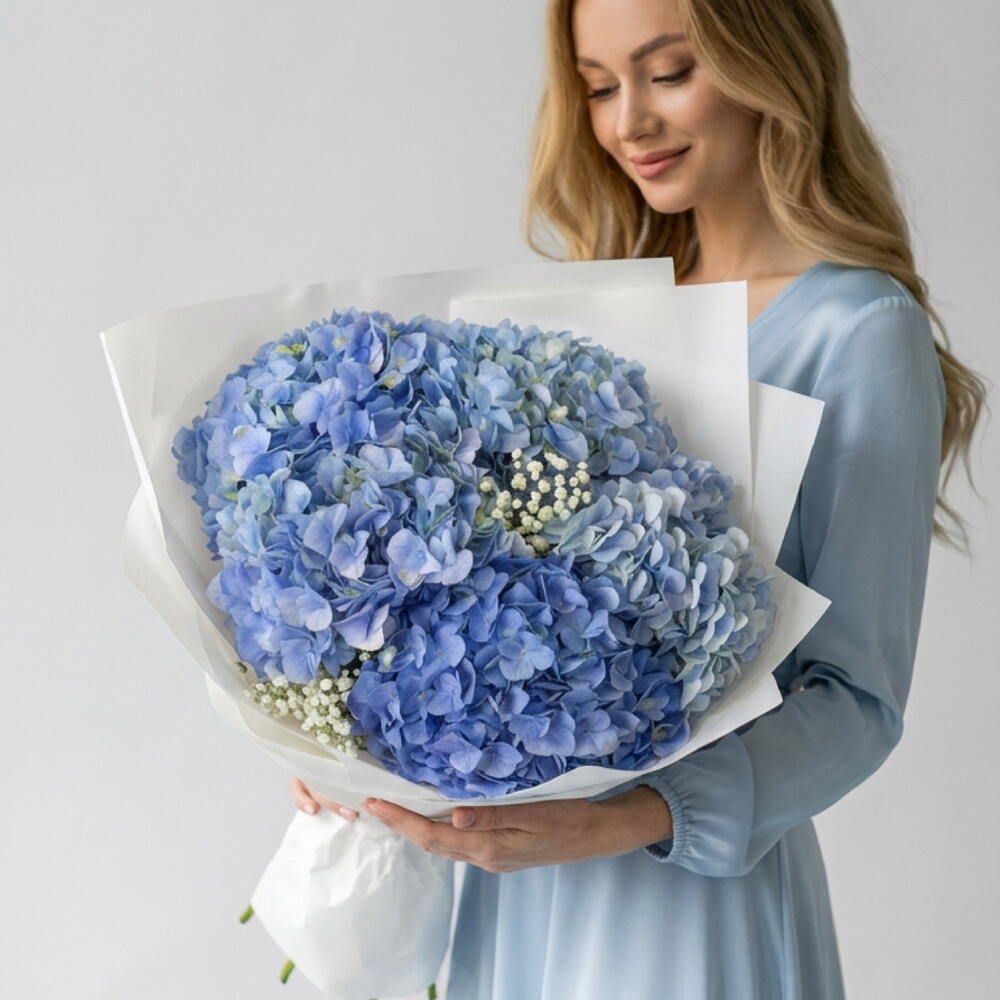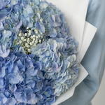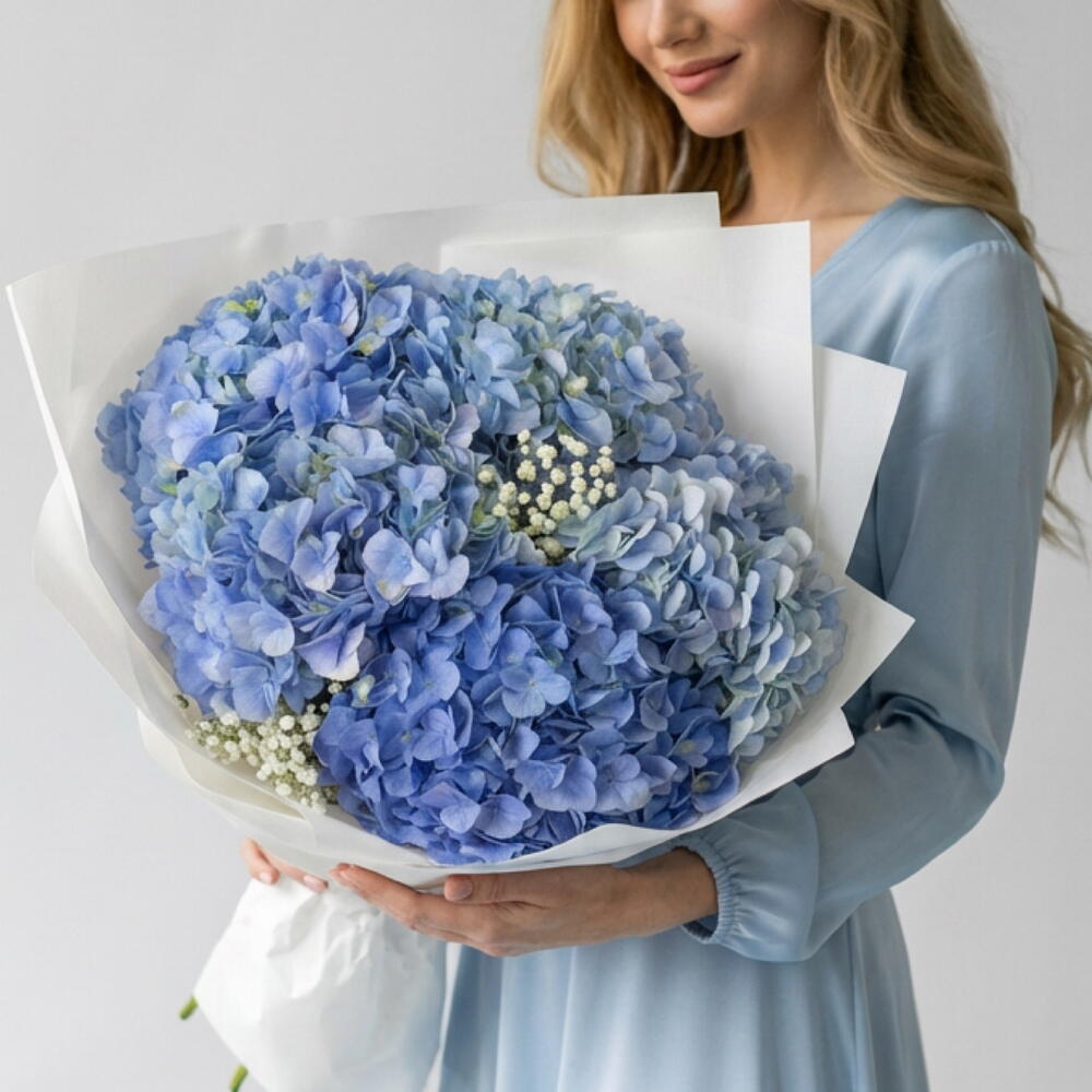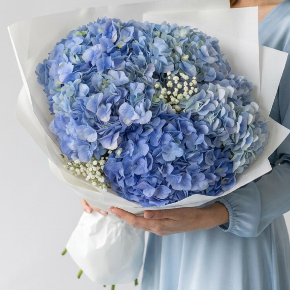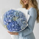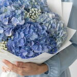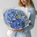 A bouquet of blue hydrangeas and gypsophila is characterized as a light and weightless composition. The airy clouds of gypsophila seem to envelop the large inflorescences of blue hydrangeas, creating a sense of lightness and harmony.