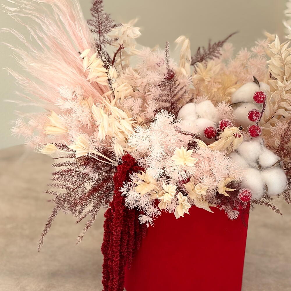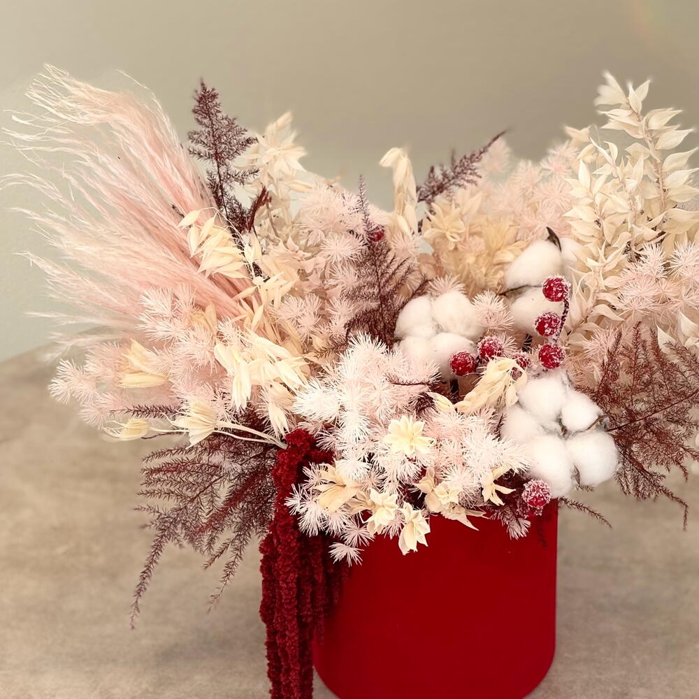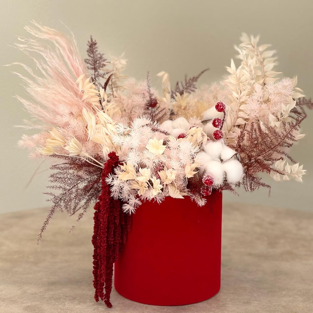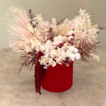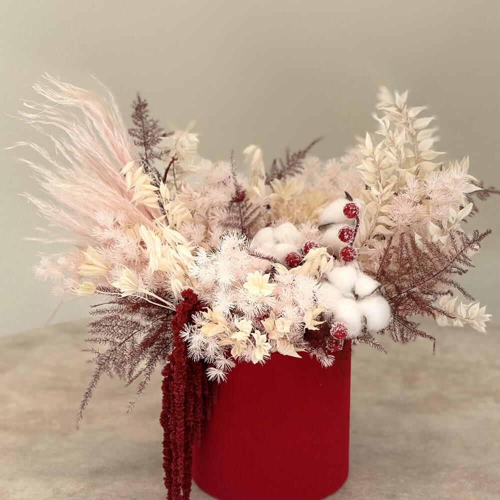 The color scheme of the bouquet is usually calm and natural — shades of beige, cream, green, and light brown create a sense of warmth and harmony. This bouquet does not require any special care and retains its shape and color for a long time, making it not only a beautiful addition to the interior but also a long-lasting decorative element that adds a touch of coziness and natural tranquility to the space.