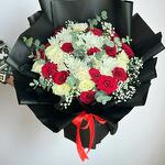 Букет из смешанных цветов в черной бумаге; 15 стеблей красных роз, 10 стеблей белых роз, 5 стеблей белой гвоздики, 4 стебля белой хризантемы, а также 4 стебля эвкалипта и гипсофилы нежно составили букет в черной бумаге.