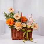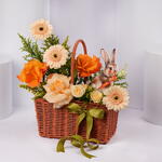 Отпразднуйте Пасху очаровательной цветочной композицией, которая объединяет мягкие весенние оттенки и праздничные акценты в красиво выполненной вручную плетёной корзине из тростника. В композицию входят персиковые герберы, ярко-оранжевые розы, нежная персиковая роза и персиковые спрей-розы, она дополнена жёлтыми наполнителями солидестер и завершена изящной зелёной лентой. Милый акриловый вырез в виде кролика добавляет игривый пасхальный акцент, делая её прекрасным подарком для близких или радостным декоративным элементом на сезон.