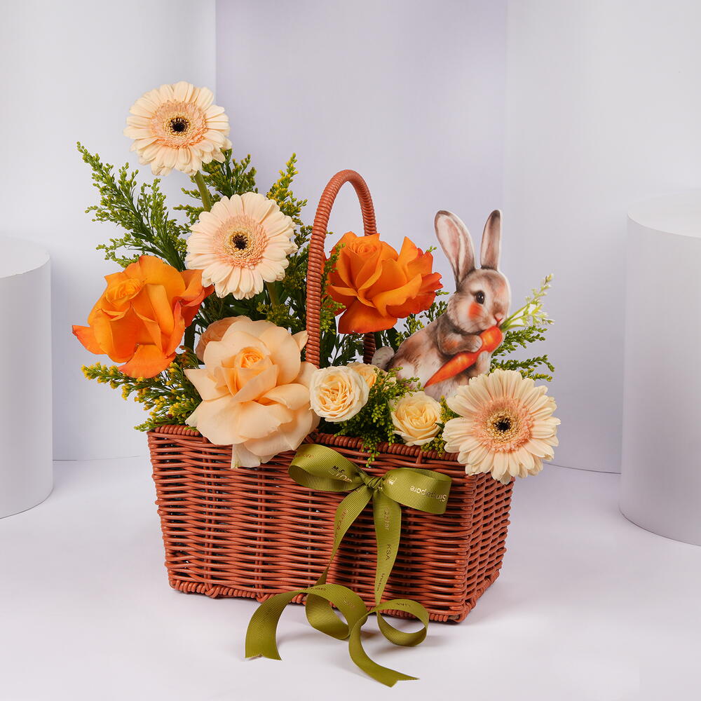 Отпразднуйте Пасху очаровательной цветочной композицией, которая объединяет мягкие весенние оттенки и праздничные акценты в красиво выполненной вручную плетёной корзине из тростника. В композицию входят персиковые герберы, ярко-оранжевые розы, нежная персиковая роза и персиковые спрей-розы, она дополнена жёлтыми наполнителями солидестер и завершена изящной зелёной лентой. Милый акриловый вырез в виде кролика добавляет игривый пасхальный акцент, делая её прекрасным подарком для близких или радостным декоративным элементом на сезон.