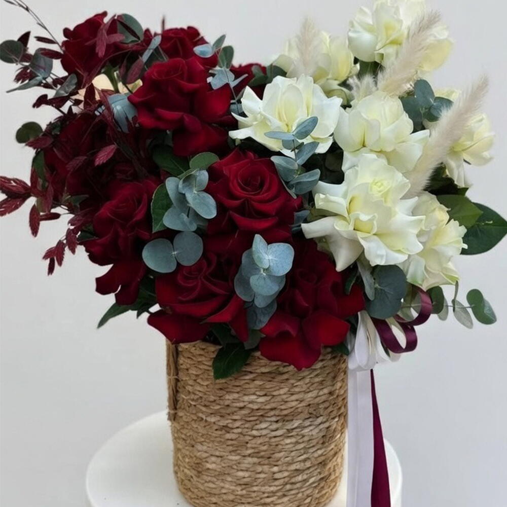 Плетеная корзина в деревенском стиле, перевязанная роскошными бордовыми и белыми атласными лентами, доверху наполнена эффектной композицией из отборных свежих бордовых роз, элегантных кремовых роз, серебристого эвкалипта и высокой пампасной травы. Композиция, составленная вручную, идеально подходит для романтического настроения и современной богемной изысканности — прекрасный подарок для влюбленных, создания осенней атмосферы или эффектного украшения дома.