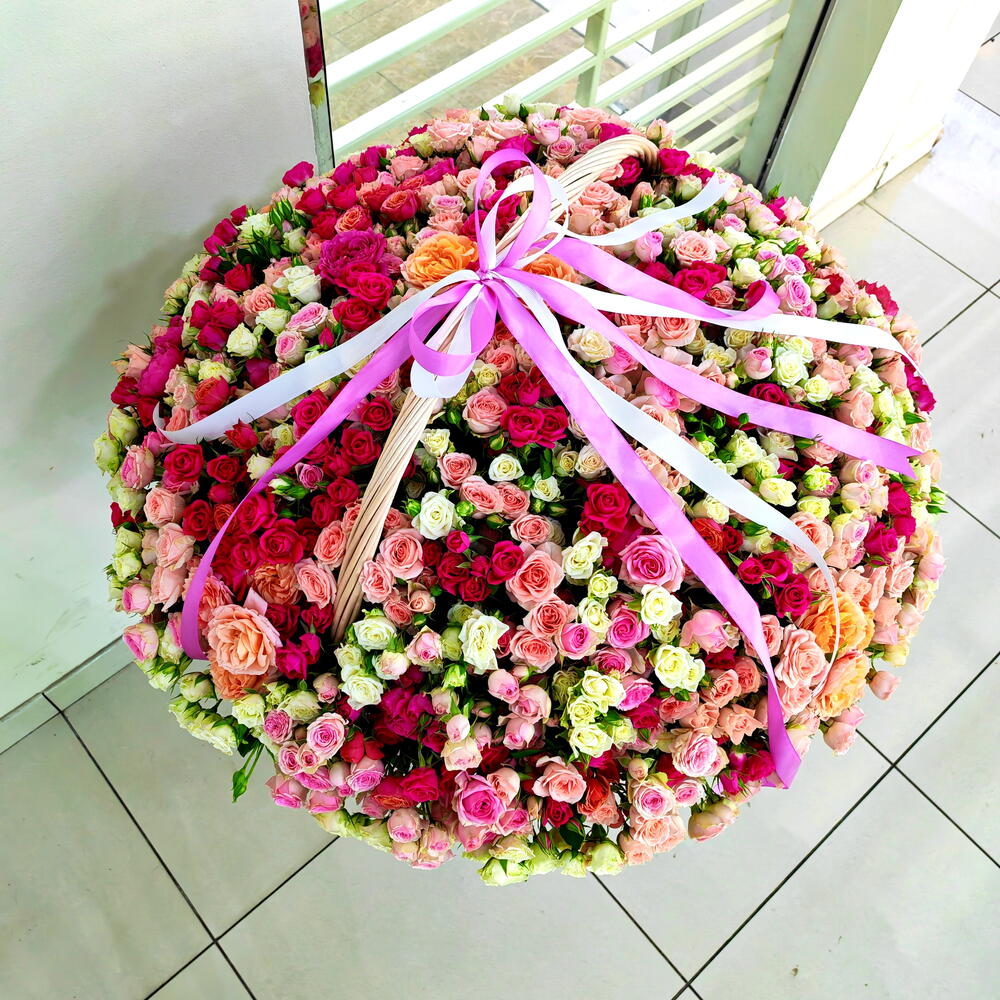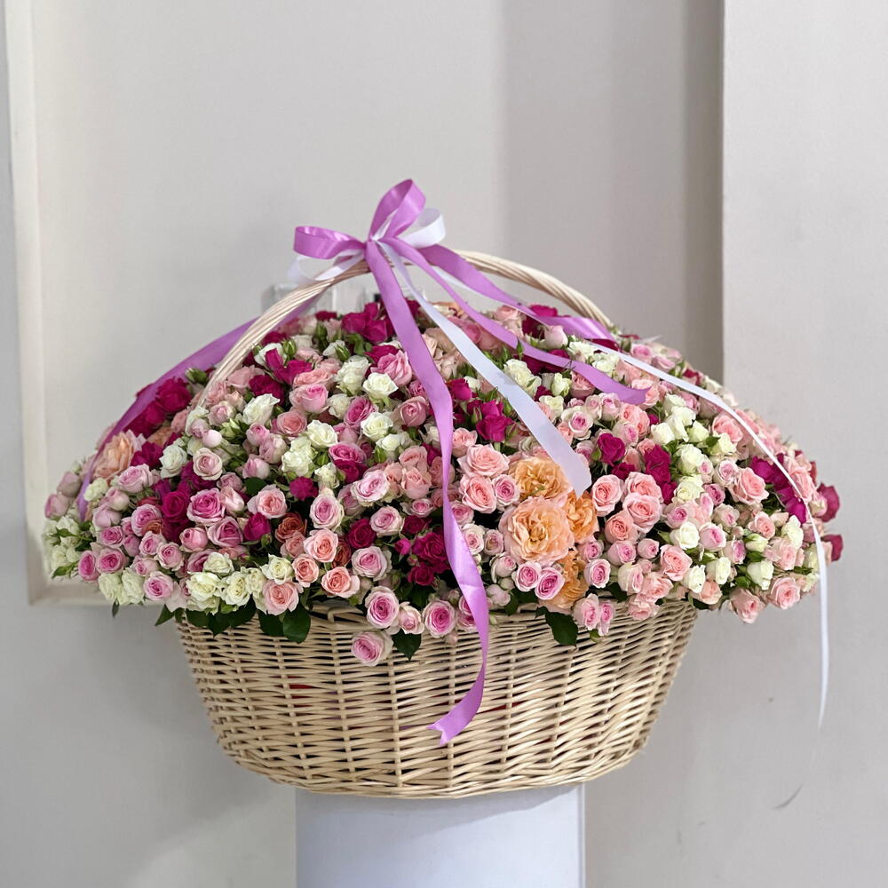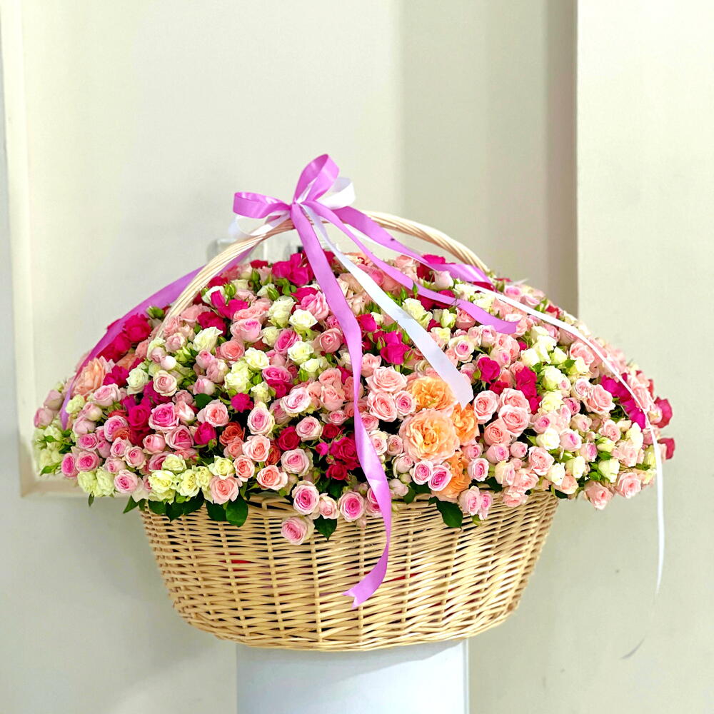 Потрясающая корзина из 250 кустовых роз, изобилующая нежно-розовыми, ярко-розовыми, кремовыми и персиковыми бутонами, красиво выполненная вручную в премиальной плетёной корзине и украшенная элегантными розовыми лентами. Эта роскошная цветочная композиция идеально подходит для свадеб, торжественных открытий, юбилеев, baby shower, роскошных подарков и незабываемых праздников. Истинное выражение любви, изящества и свежести, которое наполняет любое пространство очарованием и ароматом.