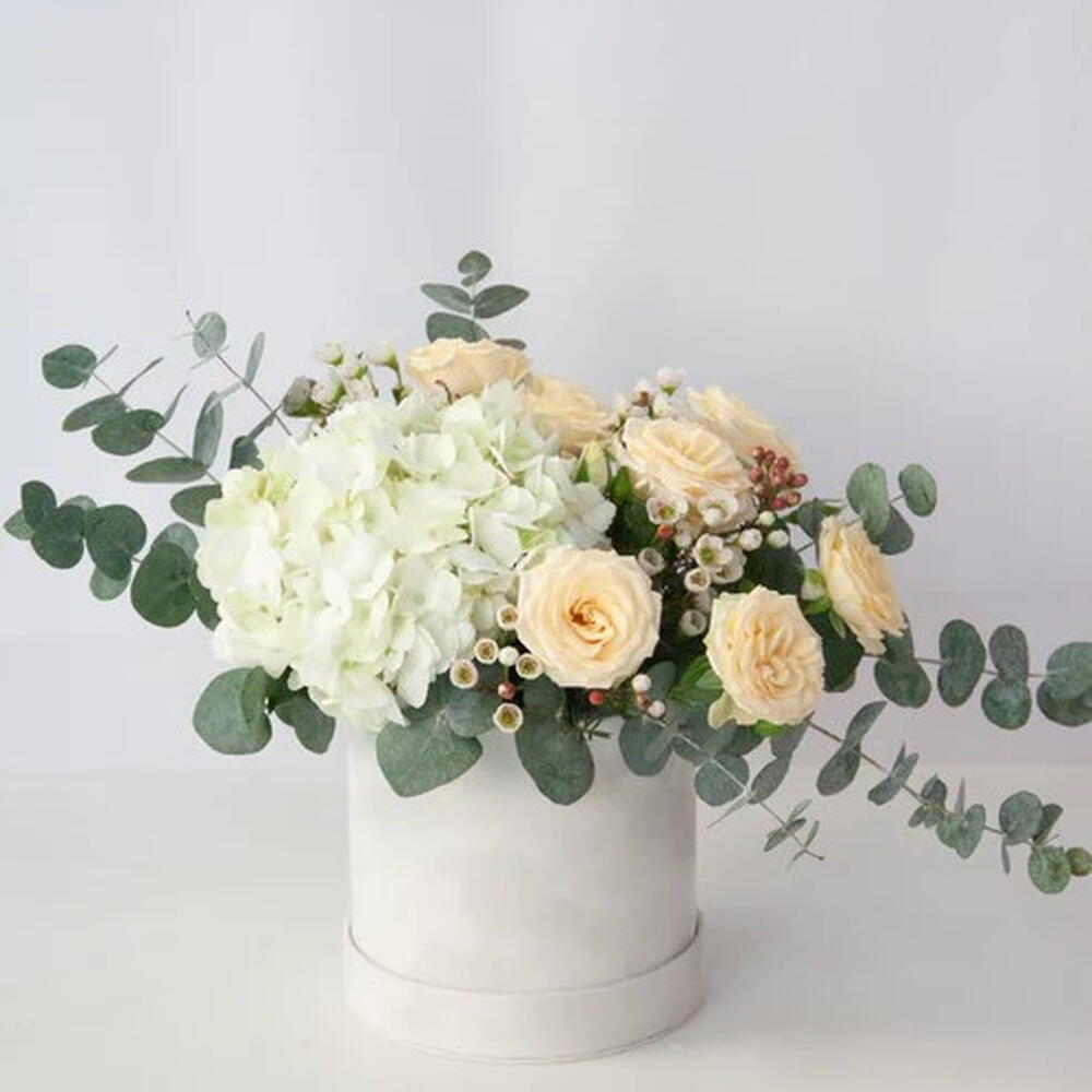 Баттеркрим Блисс белая гортензия и персиковые мини-розы в коробке