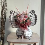 Нежный букет, вдохновлённый бабочкой, с розовой гортензией в центре, окружённой восемью элегантными розовыми розами, пятью нежно-розовыми гвоздиками и двумя веточками розовой альстромерии. Композиция, дополненная двумя сухими наполнителями, завершается крыльями бабочки, которые придают цветочной композиции причудливый штрих изящества и красоты.