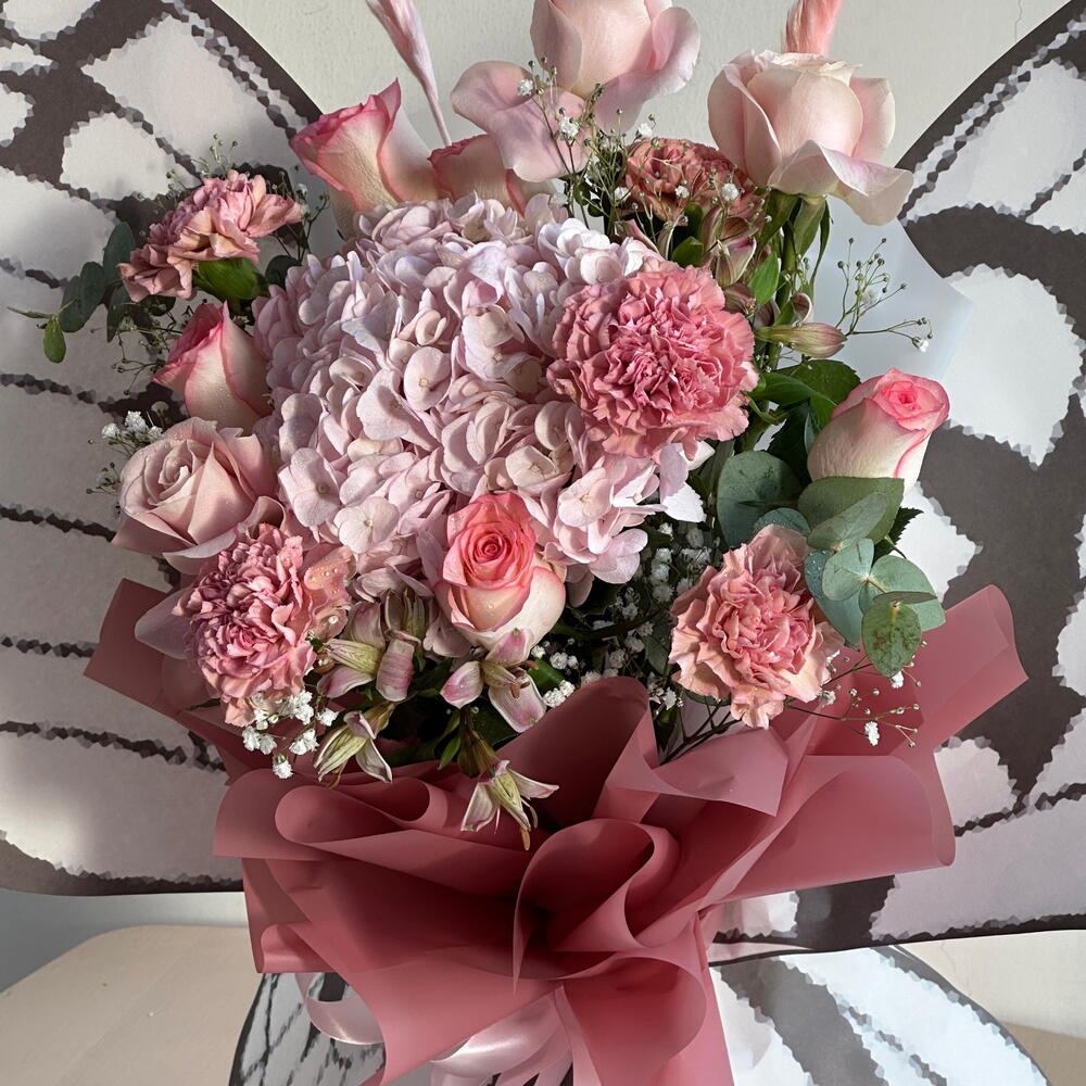 Нежный букет, вдохновлённый бабочкой, с розовой гортензией в центре, окружённой восемью элегантными розовыми розами, пятью нежно-розовыми гвоздиками и двумя веточками розовой альстромерии. Композиция, дополненная двумя сухими наполнителями, завершается крыльями бабочки, которые придают цветочной композиции причудливый штрих изящества и красоты.