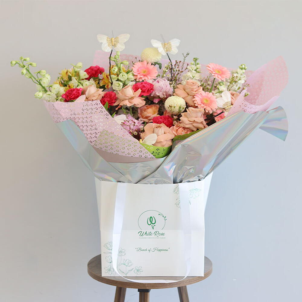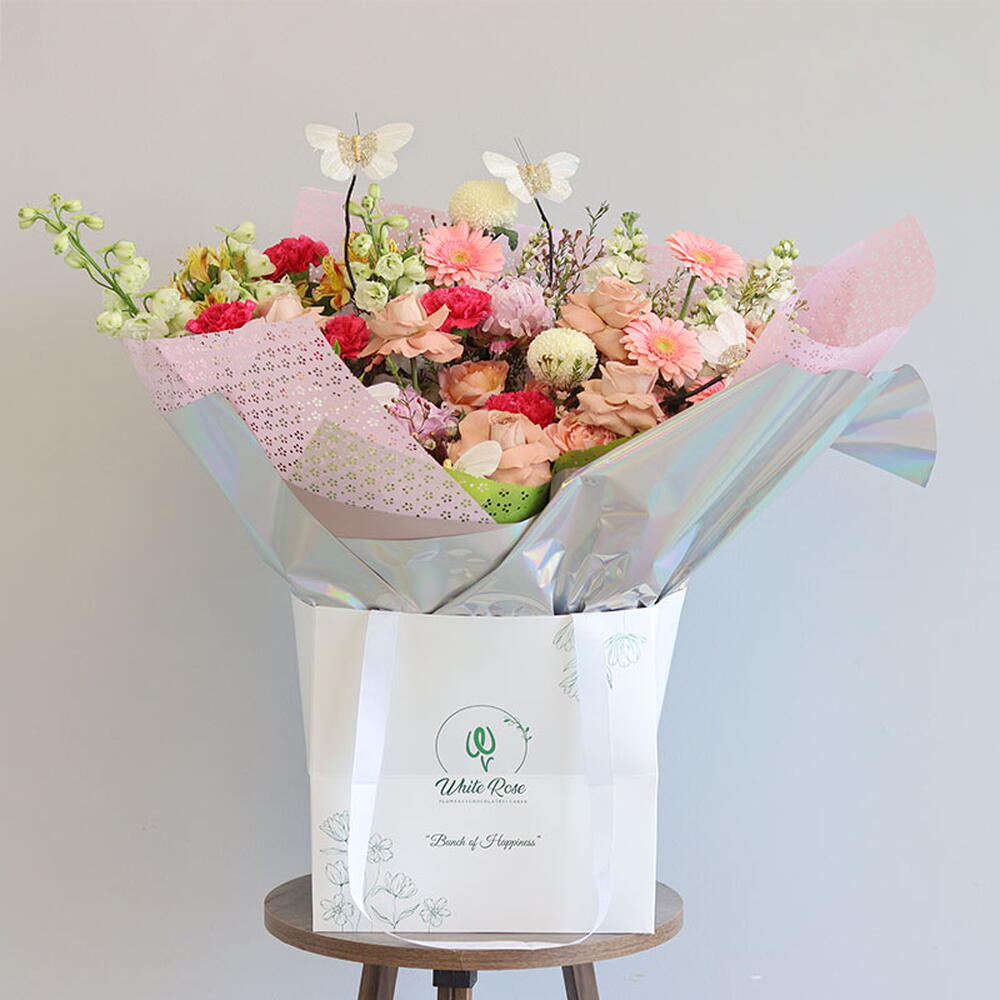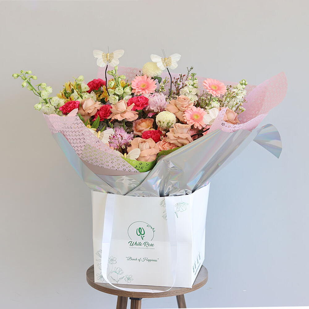 Букет из гербер, дельфиниума, роз капучино и других цветов, оформленный в сумке.