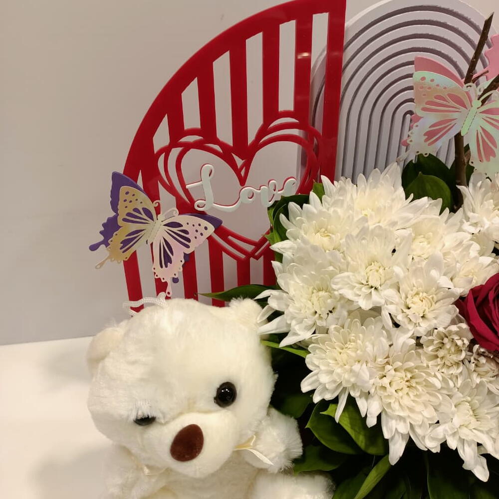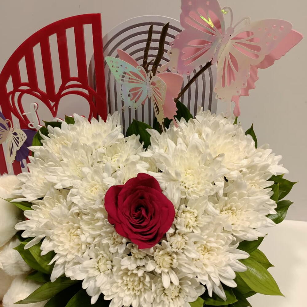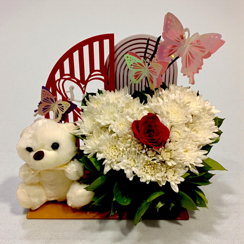 Очаровательный и праздничный подарочный набор с пышной сердцевидной композицией кремово-белых хризантем, в центре которой — одна яркая красная роза. Композиция игриво украшена цветными бабочками-топперами и расположена на фоне арочных декоративных панелей. В комплект входит плюшевый белый медвежонок, а это причудливое оформление представлено на деревянной подставке, что делает его идеальным подарком на день рождения, для новорождённых или приятным сюрпризом.