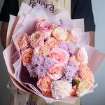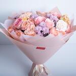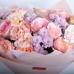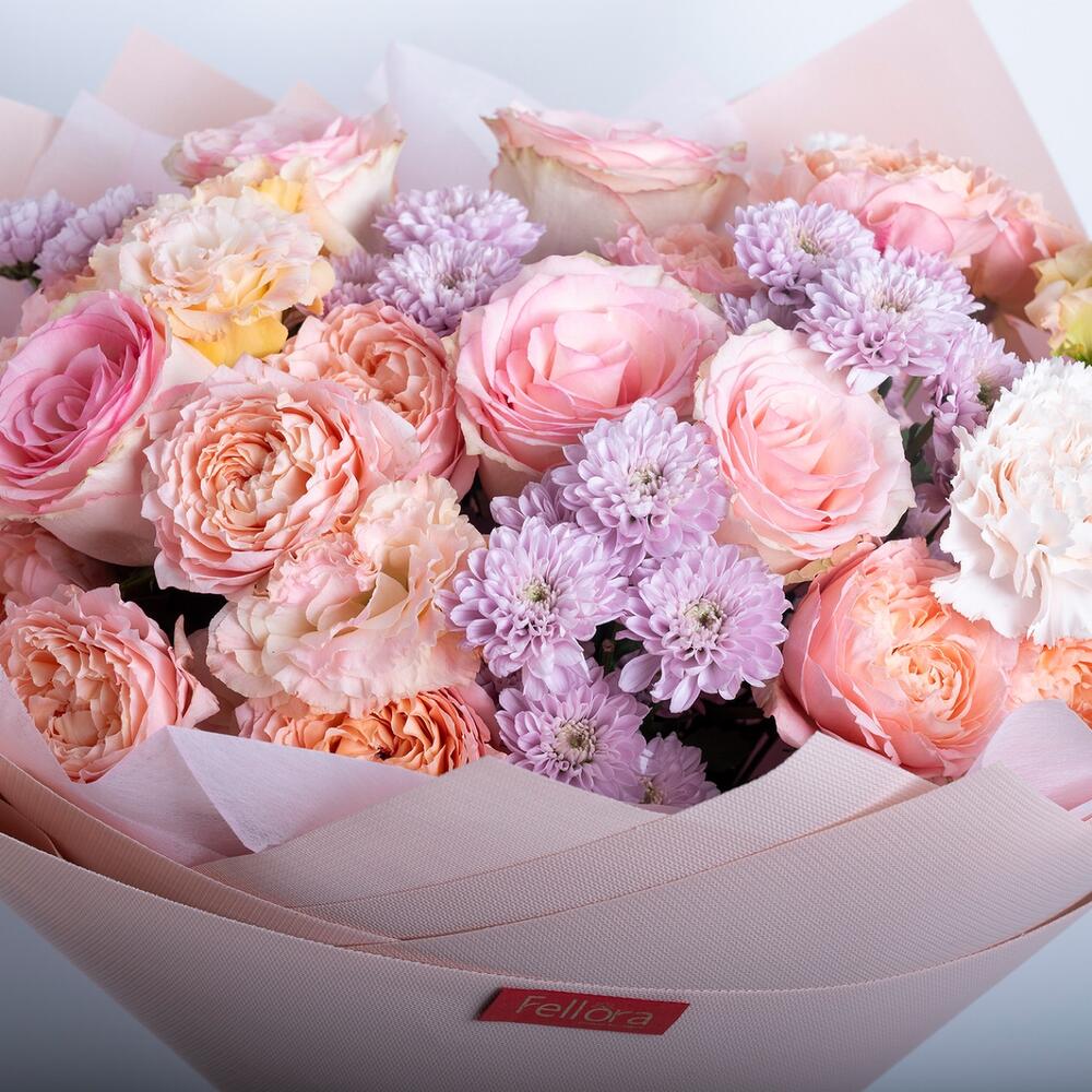 Прекрасный букет! В нём прекрасная пастельная палитра. Вот список цветов, которые я могу различить в композиции: Розы – Крупные, нежно-розовые цветы – классические розы, добавляющие элегантности и романтики. Гвоздики – Гофрированные, нежно-персиковые и белые цветы – это гвоздики, известные своей текстурой и пышностью. Хризантемы (хризантемы) – Небольшие лавандово-сиреневые цветы добавляют мягкий акцент и контрастную форму. Садовые розы или кустовые розы – Некоторые персиковые цветы с более густыми лепестками напоминают садовые или кустовые розы, которые часто используются в роскошных композициях благодаря своему многослойному виду. Букет упакован в бумагу нежно-розовых и румяных тонов, что усиливает общую нежную и романтичную атмосферу. Дайте мне знать, если вам нужны идеи, как использовать этот букет или подарить его!