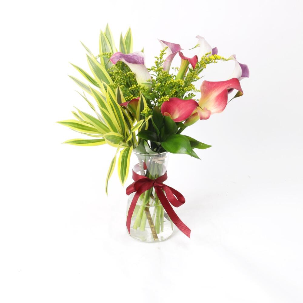 4 стебля красной калы 4 стебля фиолетовой калы 2 стебля «Песнь Индии» 2 стебля солидаго 2 стебля зелёного рускуса 1 стеклянная ваза Перевязана бантом из бордовой ленты