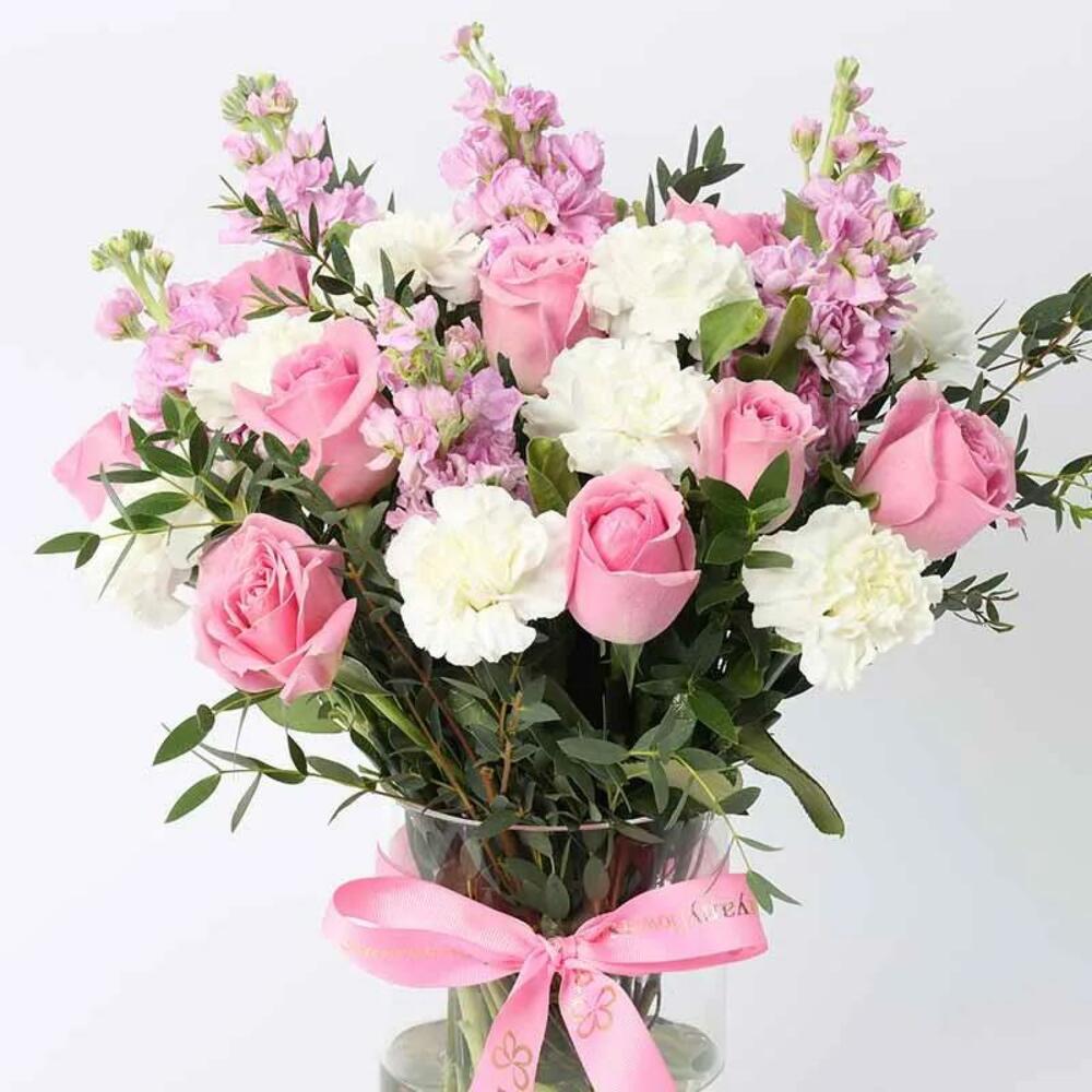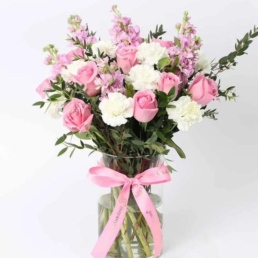 10 розовых роз 10 белых гвоздик 5 розовых маттиол Листья парвифолии Красиво оформлено в цилиндрической вазе