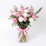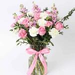 розовые стебли маттиолы - 5 шт. цилиндрическая ваза - 1 шт. стебли розовых роз - 10 шт. стебли белой гвоздики - 10 шт.