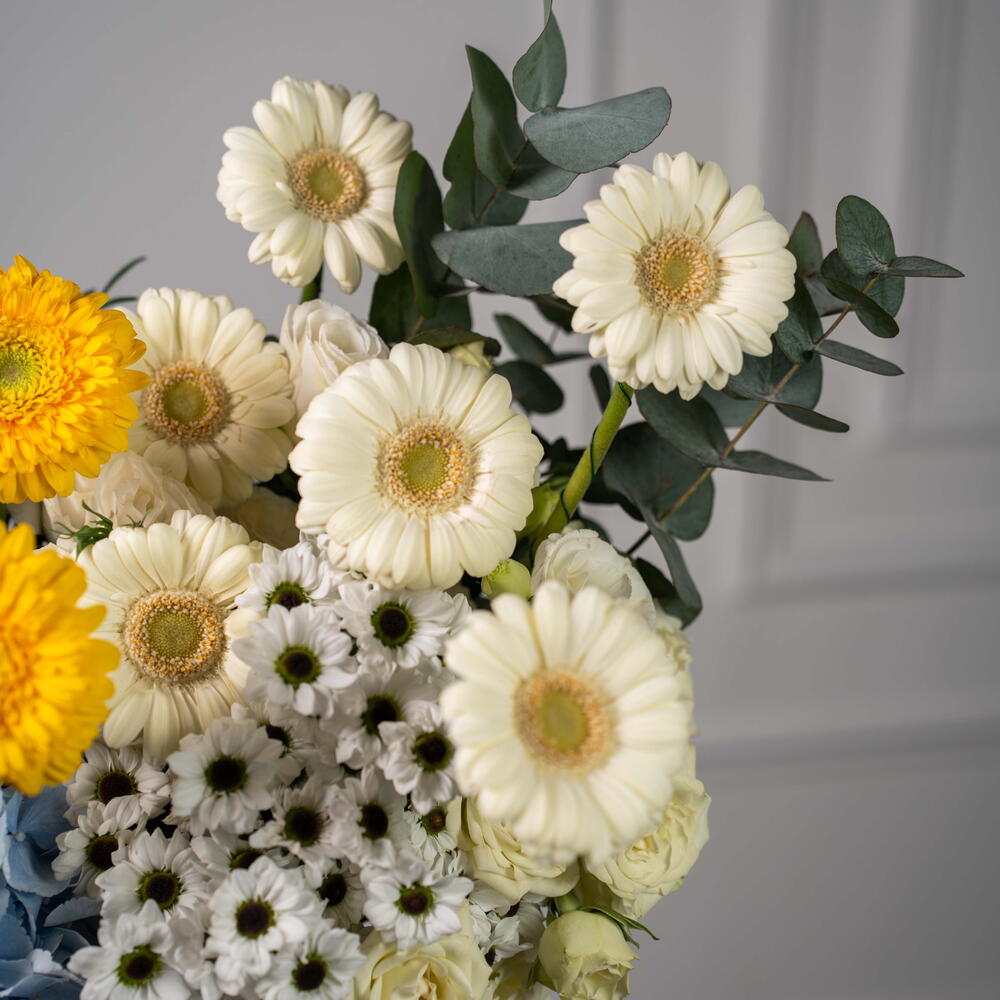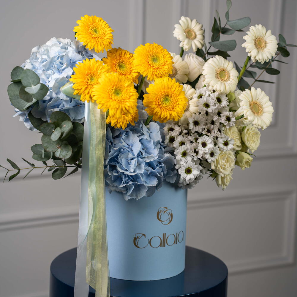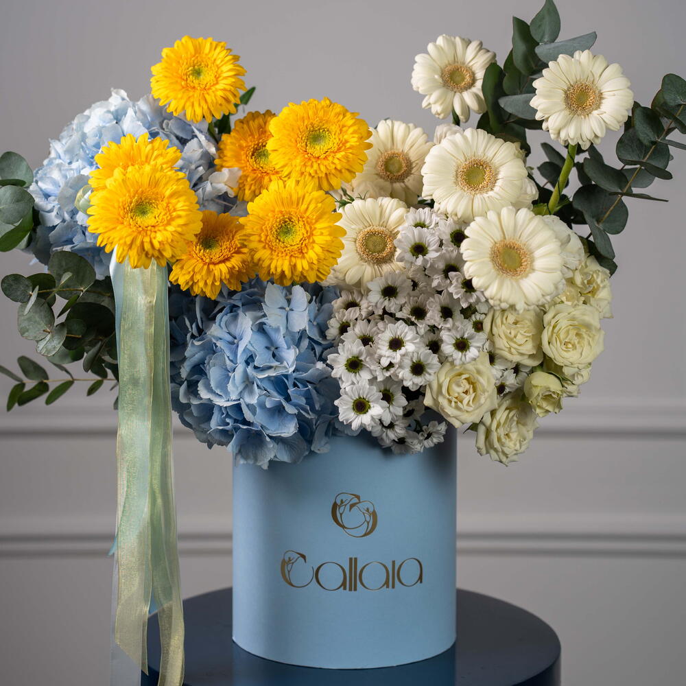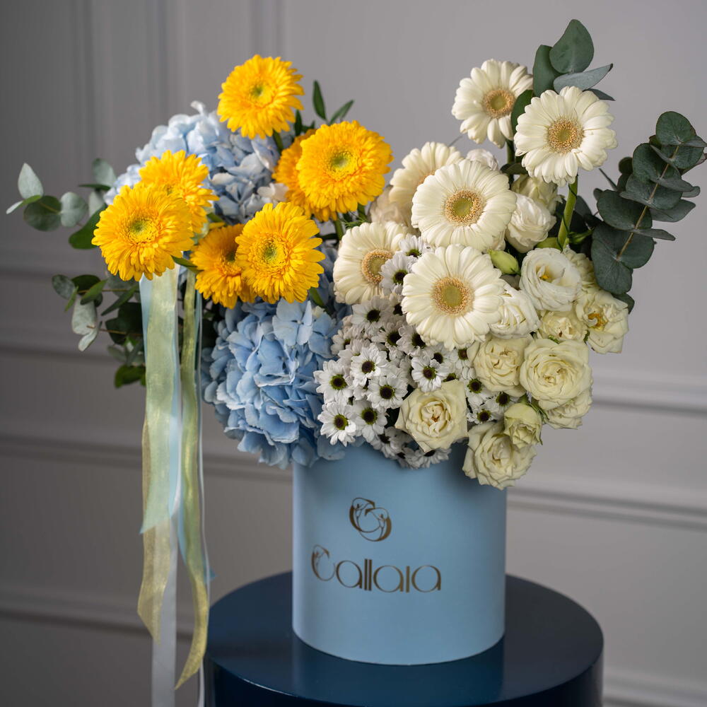 Окунитесь в прекрасное сочетание элегантности и свежести с этим уникальным букетом цветов в коробке. Тщательно подобранная вручную композиция включает в себя 2 свежих эвкалипта, 1 мягкую основу из белой эустомы и 2 нежных белых кустовых розы. Дополняют её сияние 6 очаровательных белых и 7 ярких жёлтых гербер. Дополнительно украшенная 4 белоснежными сантини и 2 воздушными небесно-голубыми гортензиями, эта цветочная композиция станет идеальным украшением для любого случая. Этот букет цветов в коробке – идеальный подарок, который выразит вашу любовь, восхищение или просто добавит в ваше пространство частичку природы.