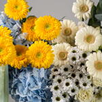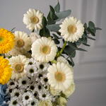 Eucalyptus - 2 шт. Eustoma white - 1 шт. spray rose white - 2 шт. гермини белая - 6 шт. жёлтая гермини - 7 шт. santini white - 4 шт. гортензия небесно-голубая - 2 шт.