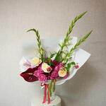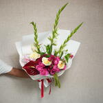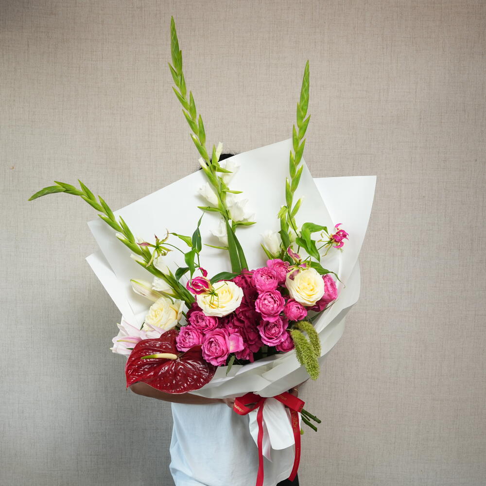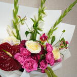 Свежий и яркий букет с розовыми розами, белыми гладиолусами, лилиями и эффектным красным антуриумом. Идеально подходит для подарков, праздников или домашнего декора. Связанный вручную с заботой и завернут в стильную белую бумагу.