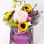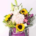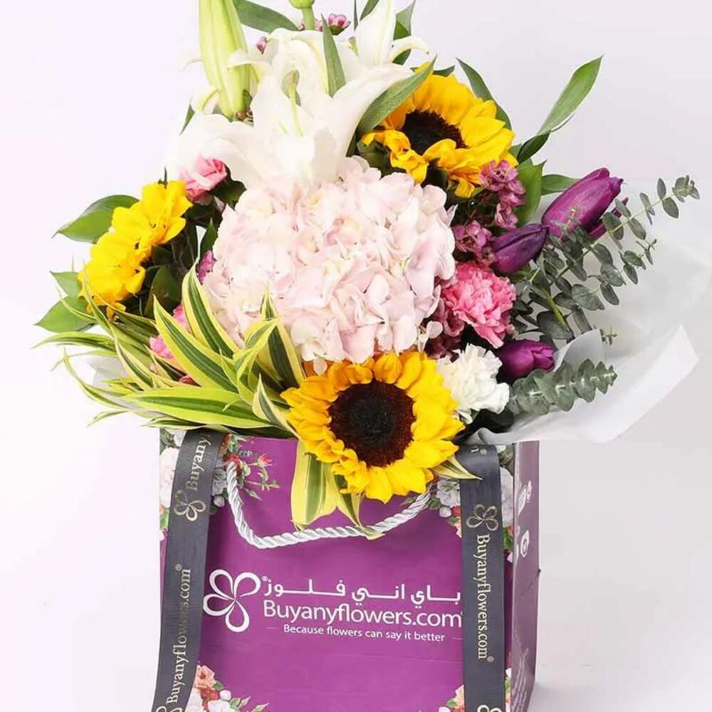 3 подсолнуха 1 белая восточная лилия (стебель) 1 розовая гортензия 4 фиолетовых тюльпана 3 розовые и 3 белые гвоздики 1 фиолетовая восковая гвоздика (стебель) Листья: 1 эвкалипт, 2 индийских хризантемы и 3 простых рускуса Упаковано и оформлено в фирменный пакет Buy Any Flowers