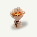 Смесь из 10 оранжевых роз, 5 конфет Ferrero Rocher и нежной гипсофилы, аккуратно оформленная в золотую упаковку для роскошного и элегантного цветочного подарка.