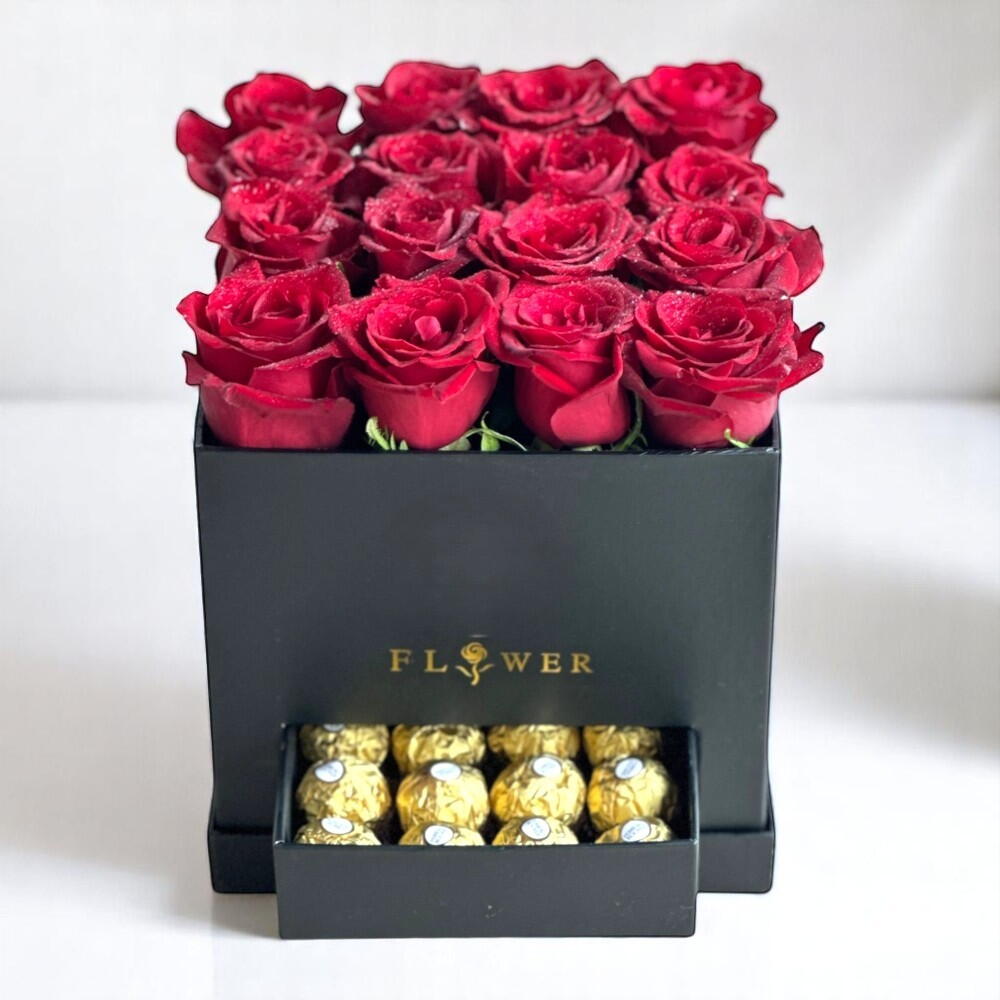 Насладитесь идеальным сочетанием романтики и сладости с этой роскошной композицией. В ней — 16 сияющих красных роз, символов страсти и любви, изящно дополненных 16 изысканными конфетами Ferrero Rocher; этот подарок — настоящее торжество нежности и наслаждения. Элегантно оформленная в стильной коробке, она — идеальный выбор ко Дню святого Валентина, годовщинам, дням рождения или любому случаю, когда любовь заслуживает праздника с размахом. ✨ Порадуйте вашу вторую половинку розами и шоколадом в одном элегантном сюрпризе. Закажите сейчас — доставка в тот же день, и заставьте его или её сердце растаять!