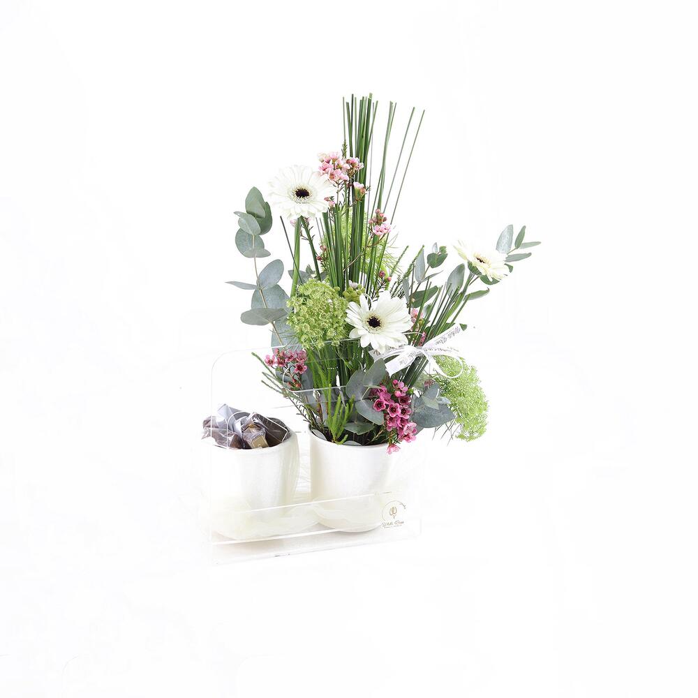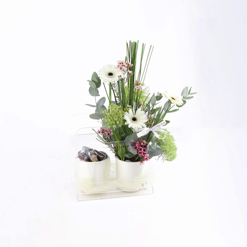 Комбинация гербер и других цветов в чашке и 300 г шоколада в чашке, оформленные в акриловой сумке