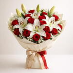 Красивый рождественский букет с 4 элегантными белыми лилиями и 15 насыщенными красными розами, дополненный нежной гипсофилой для снежного, праздничного акцента. Классическое красно-белое сочетание идеально передаёт тепло и очарование праздничного сезона.