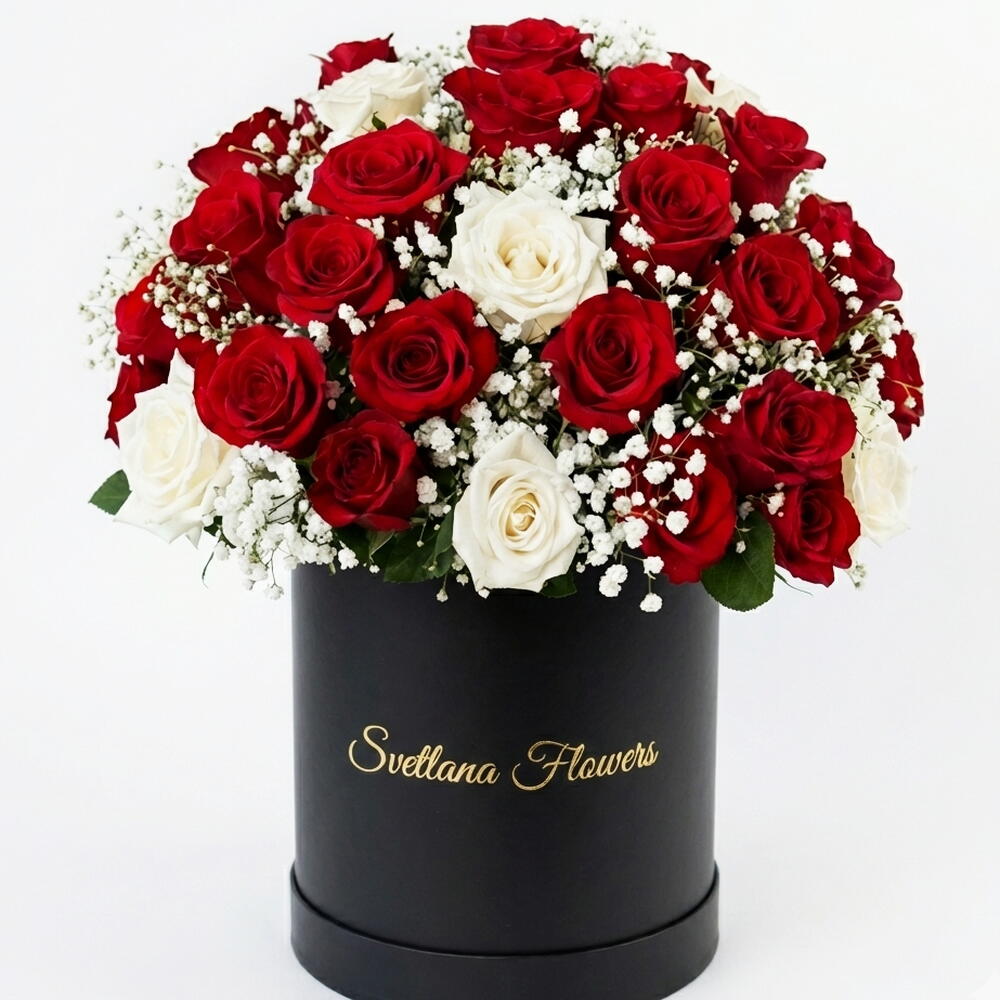 Red rose - 40 шт. White rose - 11 шт. black box - 1 шт.