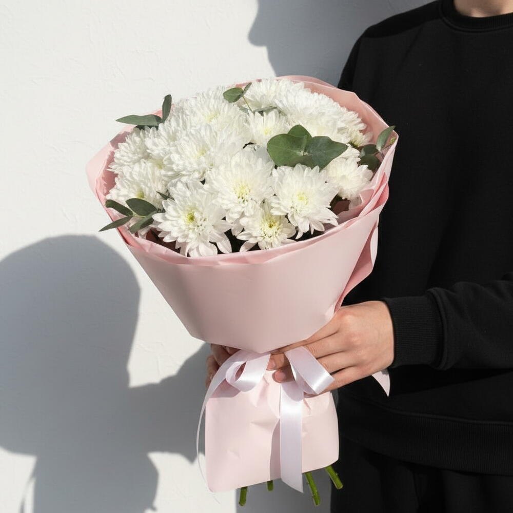 Wrapping - 5 шт. white chrysanthemum - 11 шт. white ribbon - 1 шт.