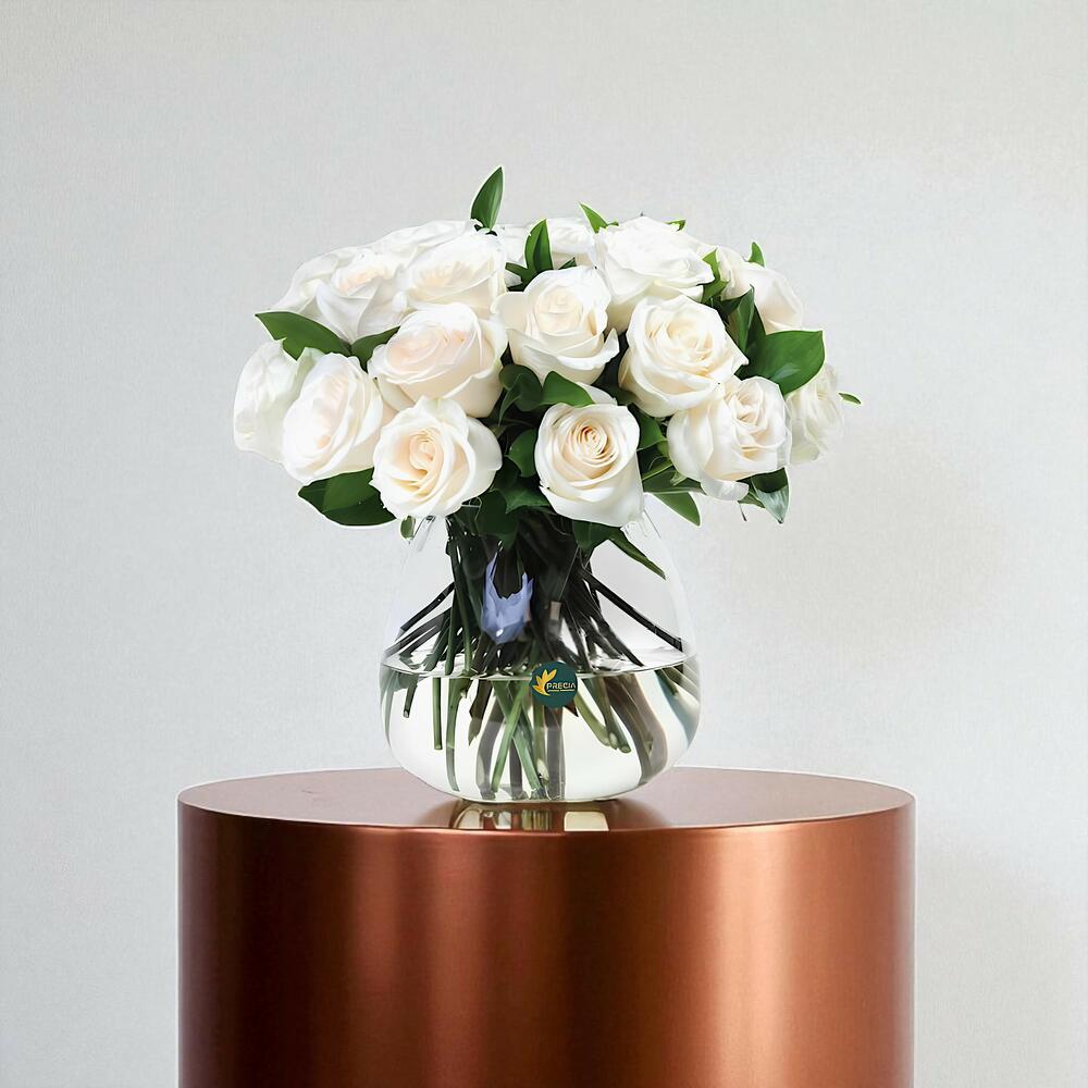 Ruscus - 2 шт. glass vase - 1 шт. white roses - 24 шт.
