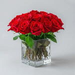Классические 15 красных роз в квадратной стеклянной вазе | Простая цветочная композиция ОАЭ