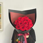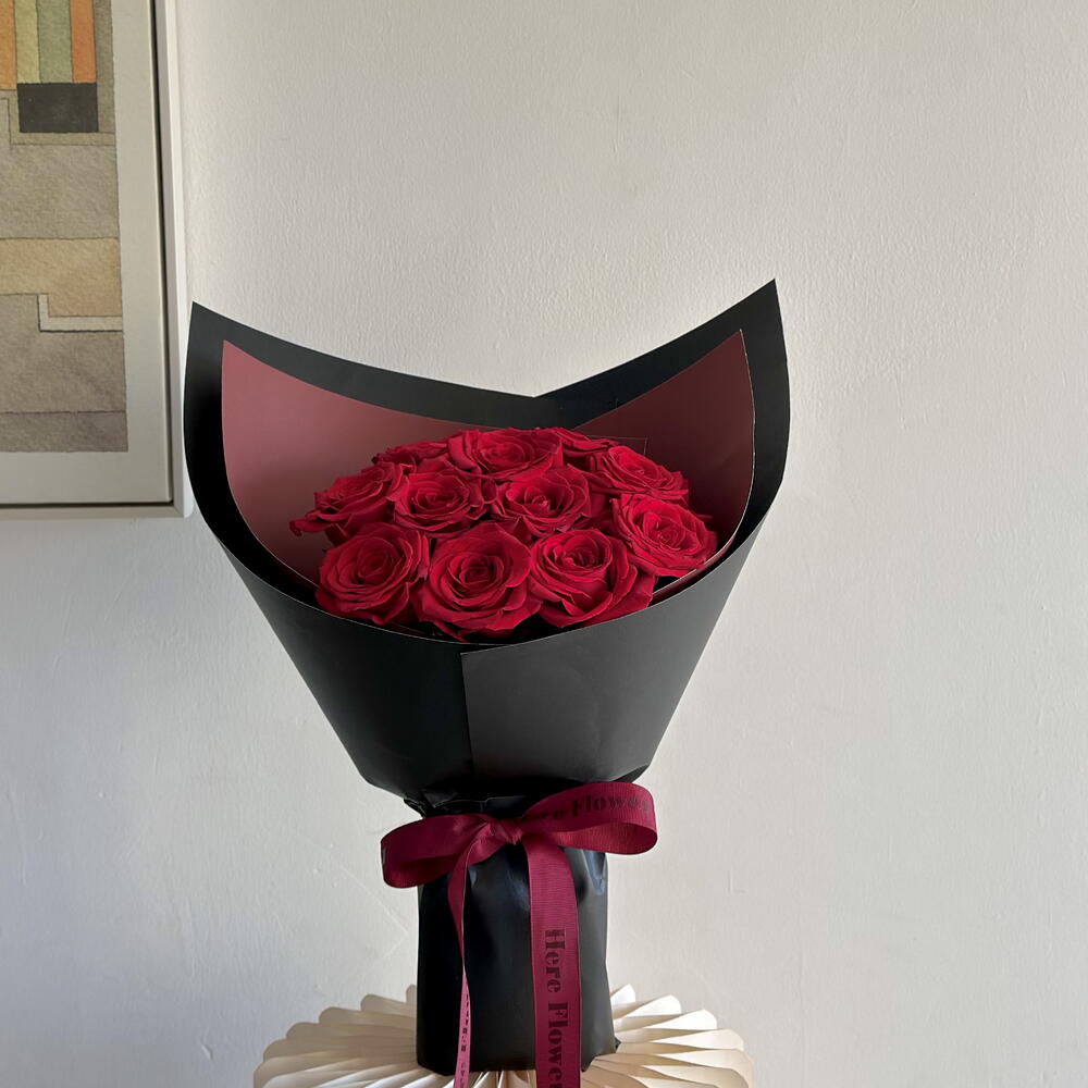 Классический букет из свежих красных роз, обёрнутый в элегантную чёрную бумагу и перевязанный глубоким тёмно-красным бантом. Простой, элегантный и выразительный — идеально подходит для выражения любви и восхищения.