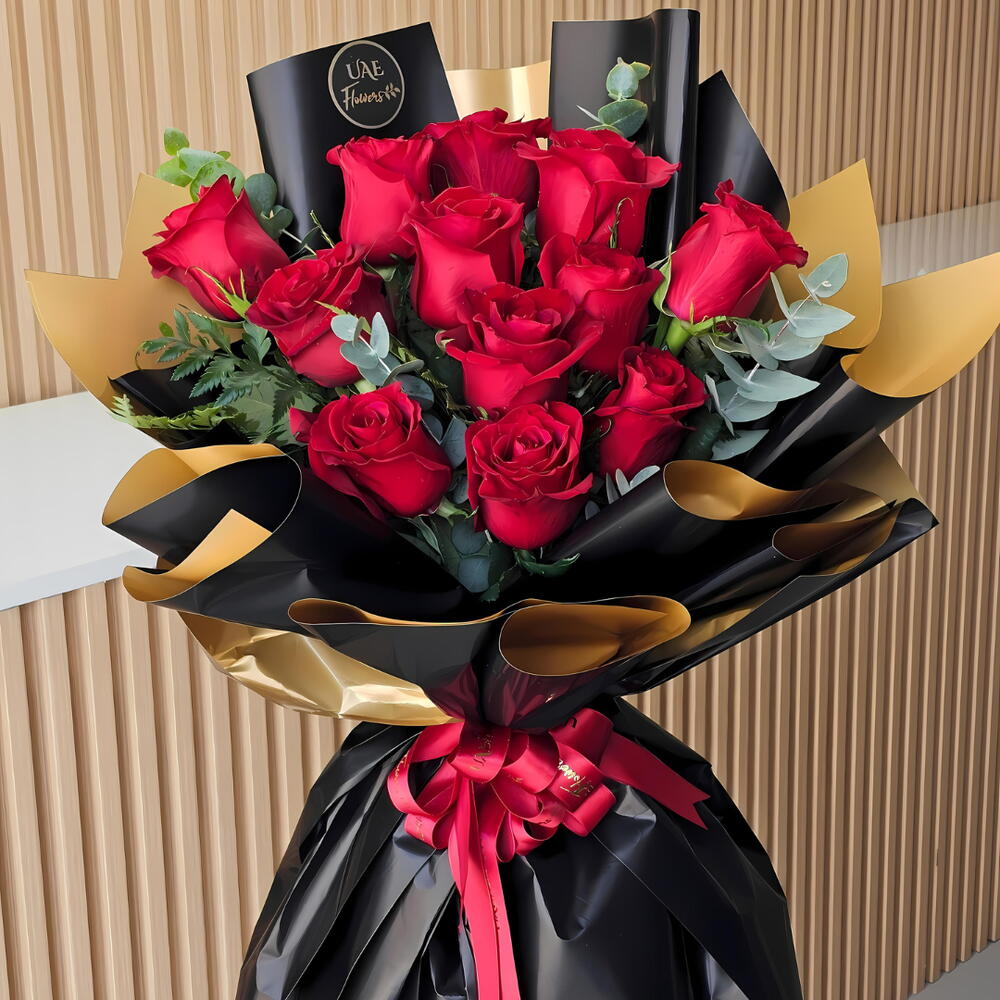 Букет из 12 красных роз в черно-красной обёртке, перевязанной красной лентой.