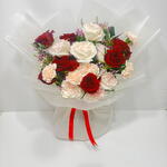 Неподвластный времени и элегантный букет с завораживающим сочетанием красных и белых роз Охара, дополненный нежными гвоздиками. Композиция красиво упакована в белую бумагу тишью и перевязана красной лентой, что делает её идеальным подарком для любого романтического случая.