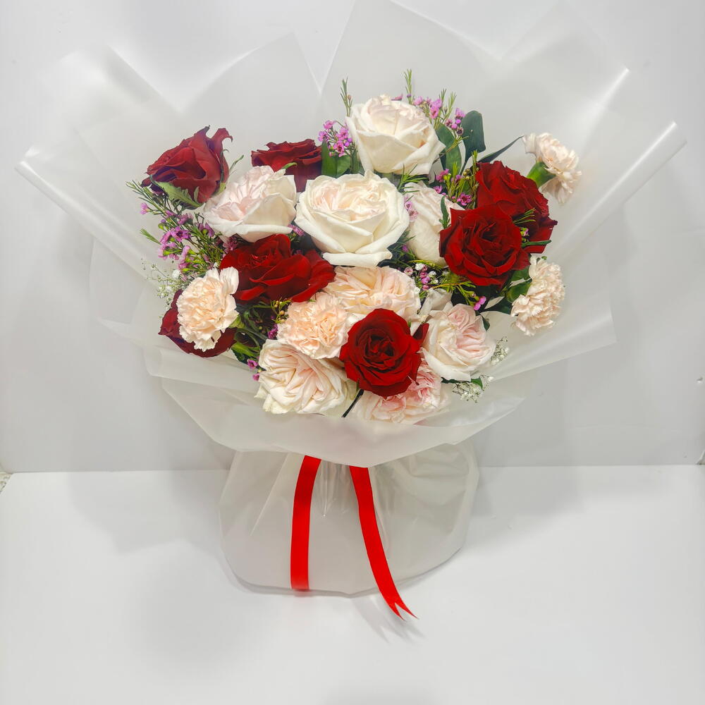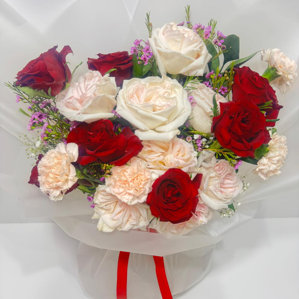 Неподвластный времени и элегантный букет с завораживающим сочетанием красных и белых роз Охара, дополненный нежными гвоздиками. Композиция красиво упакована в белую бумагу тишью и перевязана красной лентой, что делает её идеальным подарком для любого романтического случая.