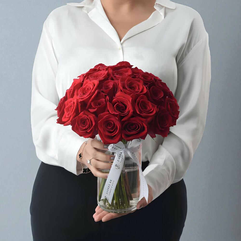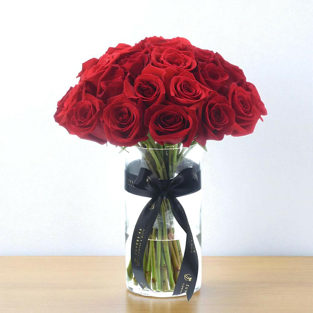Представленная в стильной цилиндрической стеклянной вазе и дополненная роскошной атласной красной лентой, эта композиция сочетает вечную красоту и современную элегантность. Созданная, чтобы произвести сильное впечатление, она идеально подходит для годовщин, предложений руки и сердца или любого случая, когда любовь в центре внимания.
