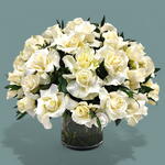 Пышная округлая композиция из элегантных белых роз в различных стадиях цветения, представленная в прозрачной стеклянной вазе на однотонном фоне.
