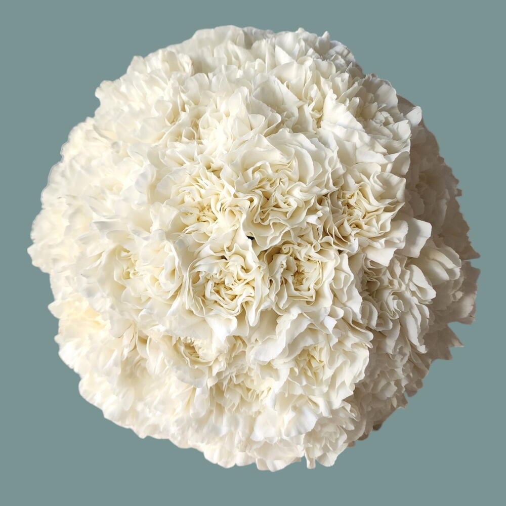 Плотный округлый букет из чисто белых гвоздик, напоминающий мягкое облако, с туго обернутым стеблем, идеально подходит для классического и элегантного акцента.