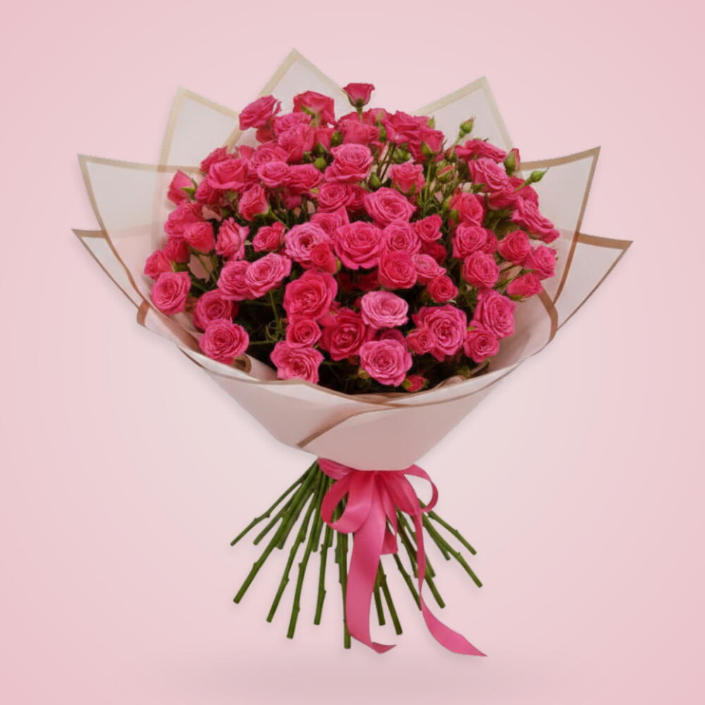 Погрузитесь в элегантность этого моно-букета, состоящего из 10 восхитительных стеблей мини-роз Glorious Pink. Каждый цветок — символ изящества, любви и красоты; он наверняка очарует любое сердце, тронутое его умиротворяющей красотой. Идеально подходит для особых случаев или просто чтобы скрасить чей-то день.