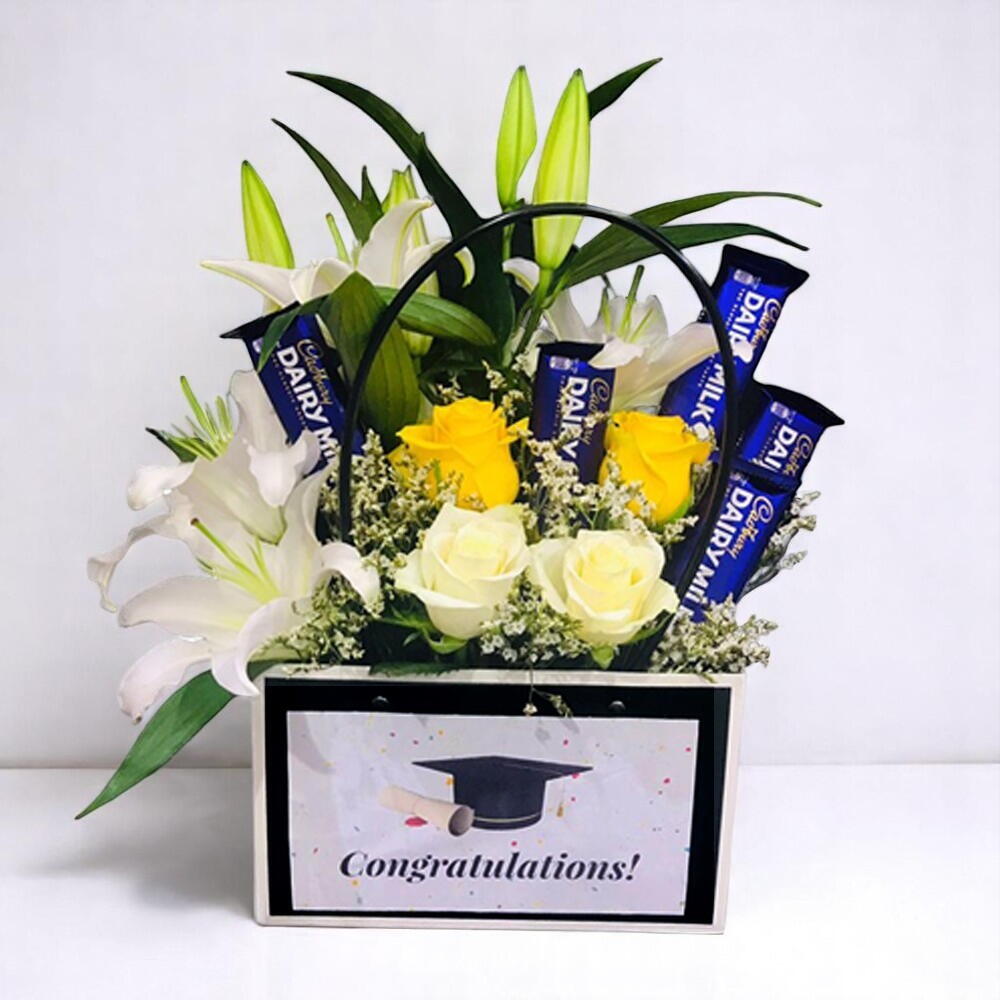 Отпразднуйте важные события стильно с помощью набора «Congrats Celebration Box» – праздничного цветочного подарка, сочетающего в себе элегантность, нежность и искреннюю радость. Эта потрясающая композиция включает в себя яркие лилии, свежие розы и сочную зелень, красиво упакованные в тематический подарочный пакет «Congrats». Дополненная пятью восхитительными шоколадными конфетами Dairy Milk и ярким фольгированным воздушным шаром «Congrats», эта композиция станет идеальным способом отметить выпускной, повышение по службе или личное достижение. Инструкция по уходу: Храните цветы в прохладном месте, защищенном от прямых солнечных лучей. Шоколадные шарики следует хранить в тени. Воздушные шары наполнены гелием и обычно держат форму 6–8 часов в зависимости от температуры. Избегайте контакта с острыми предметами и нагревания.