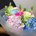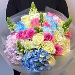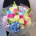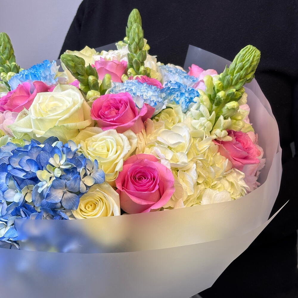 Принесите красоту весеннего утра в дом! Эта яркая, пышная композиция представляет собой эффектный акцент из кобальтовых и небесно-голубых гортензий в сочетании с радостными розовыми розами. Сочетание текстур — от рюшей гвоздик до высоких, набирающих бутоны львиных зевов — создаёт ощущение радостной энергии. Идеально упаковано и перевязано нашей фирменной лентой, это идеальный сюрприз «просто так».