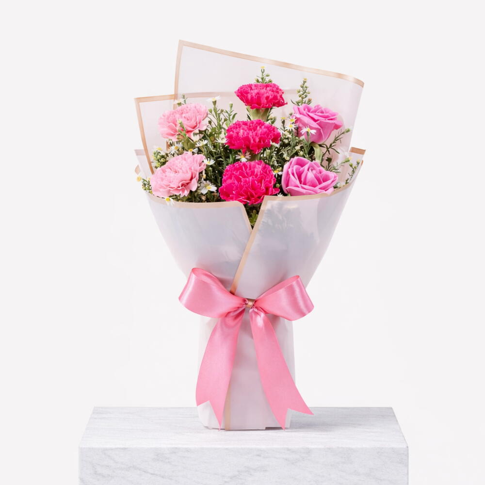 Розовые розы с акцентами светло-розовых гвоздик — элегантно, с текстурой. Темно-розовая гвоздика 3 стебля, Светло-розовая гвоздика 2 стебля, Розовая роза 2 стебля, Белая ромашка 2 стебля