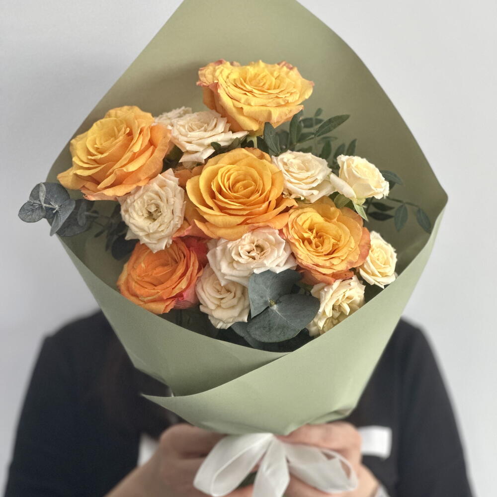 Этот потрясающий букет представляет собой яркий микс оранжевых роз, дополненный нежными, теплыми оттенками персиковых кустовых роз сорта Салинаро. Яркие, огненно-оранжевые розы добавляют нотку страсти и энергии, а нежные персиковые кустовые розы создают нежный, романтичный контраст. В композицию вплетены элегантные веточки фисташки, которые придают насыщенный, глубокий зеленый оттенок и текстуру, контрастирующую с нежными цветами. Букет дополняют веточки свежих листьев эвкалипта, наполняющие композицию освежающей, ароматной эссенцией. В результате получается прекрасно сбалансированное сочетание ярких цветов, текстуры и аромата, что делает эту композицию идеальным выбором для любого особого случая.