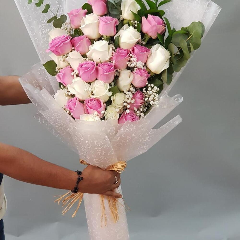 Румянец сахарной ваты: 10 белых роз 10 розовых роз с сезонной зеленью