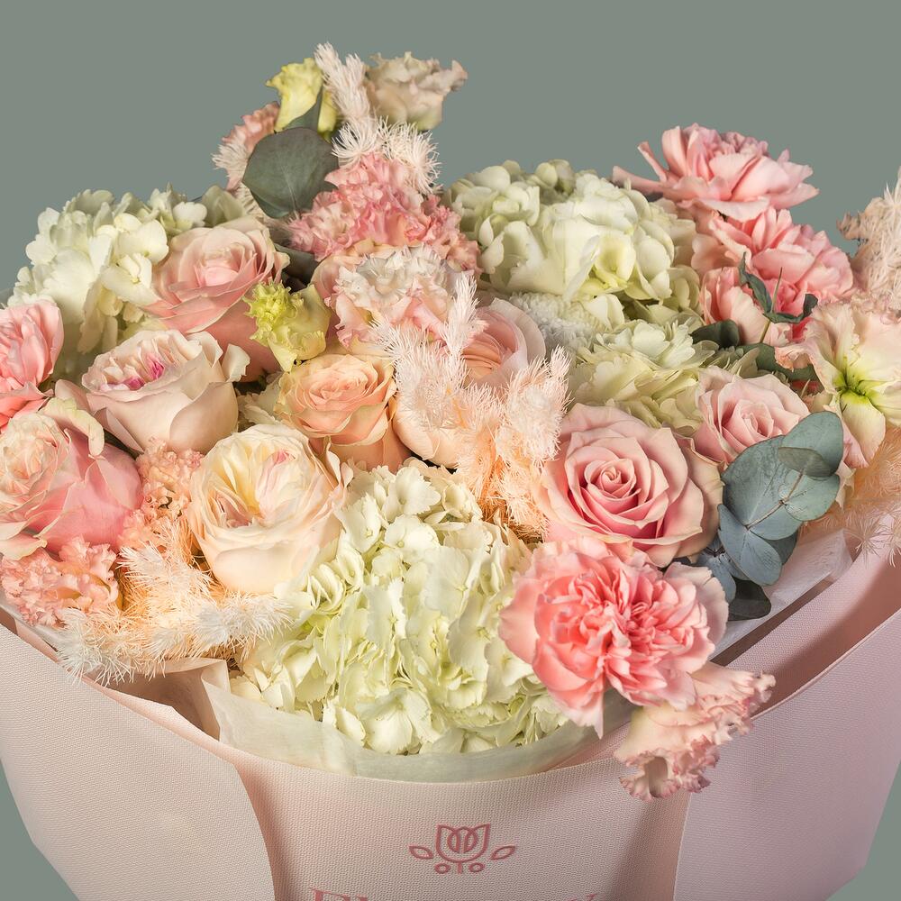 Eustoma - 2 шт. Hydrangea - 4 шт. Wrapping - 1 шт. carnation - 5 шт. asparagus - 1 шт. ranunculus - 2 шт. rose david austin - 3 шт. chrysanthemum spray - 3 шт. blad pistacia - 2 шт. rose pink mondial 60 ecu - 7 шт.