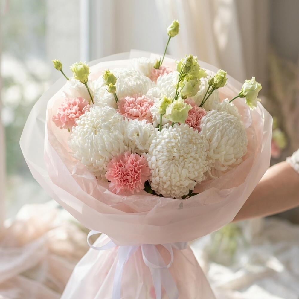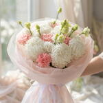 Мечтательное сочетание облакоподобных белых хризантем и пастельно-розовых гвоздик для премиальной, воздушной эстетики. Идеально подходит для дней рождения, годовщин или чтобы любой день казался сказкой. Отказ от ответственности Примечание: Реальные цвета и оттенки могут незначительно отличаться из-за естественного освещения и настроек отображения экрана.