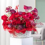 Elevate any space with our Crimson Charm basket, bursting with elegance and passion. Featuring open red roses, spray roses, pink hydrangeas, vibrant anthuriums, and lush foliage, this arrangement captivates with its rich crimson hues and enchanting allure. Perfect for gifting or adding a touch of opulence to your decor.