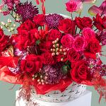 Hydrangea - 5 шт. Anthurium - 3 шт. chrysanthemum single - 4 шт. hypericum - 3 шт. asparagus - 1 шт. matthiola - 3 шт. rose david austin - 4 шт. willow basket - 1 шт. oasis (foam) - 3 шт. dry lagurus bundle red - 7 шт. rose freedom 60 ecu - 15 шт. rose spray mirabel - 3 шт.
