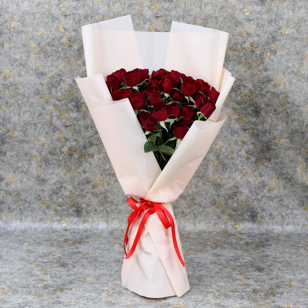 11 красных мини-роз Красиво упакованы в обёртку пастельного цвета Перевязаны красной лентой