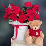 Red rose - 15 шт. Eucalyptus - 3 шт. Box - 1 шт. Teddy bear - 1 шт. bunny ear - 3 шт.