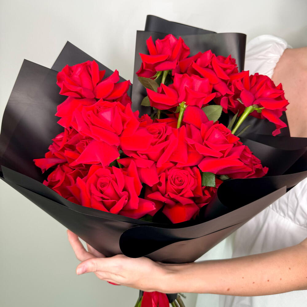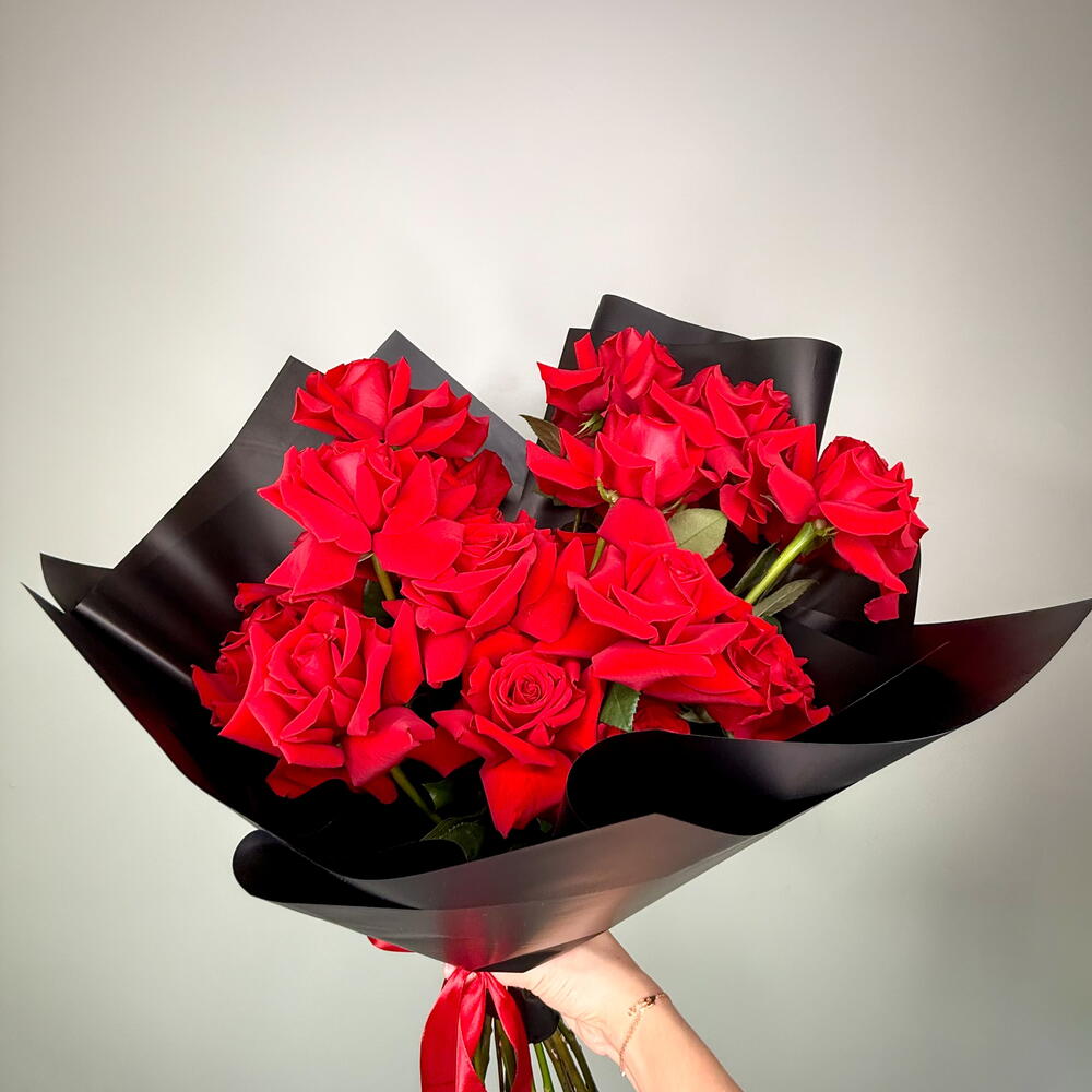 Смелый и романтичный букет из 11 премиальных красных роз, элегантно упакованный в стильную чёрную бумагу и перевязанный насыщенной красной лентой. Эта классическая композиция символизирует глубокую любовь, страсть и вечную элегантность — идеально подходит для годовщин, Дня святого Валентина, предложений руки и сердца, дней рождения или любого момента, который заслуживает яркого проявления любви. Ручная работа опытных флористов с использованием свежих роз с длинными стеблями для максимальной красоты и аромата.