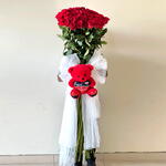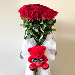 teddy - 1 шт. розы с длинными стеблями - 51 шт. бант из сетки - 1 шт.