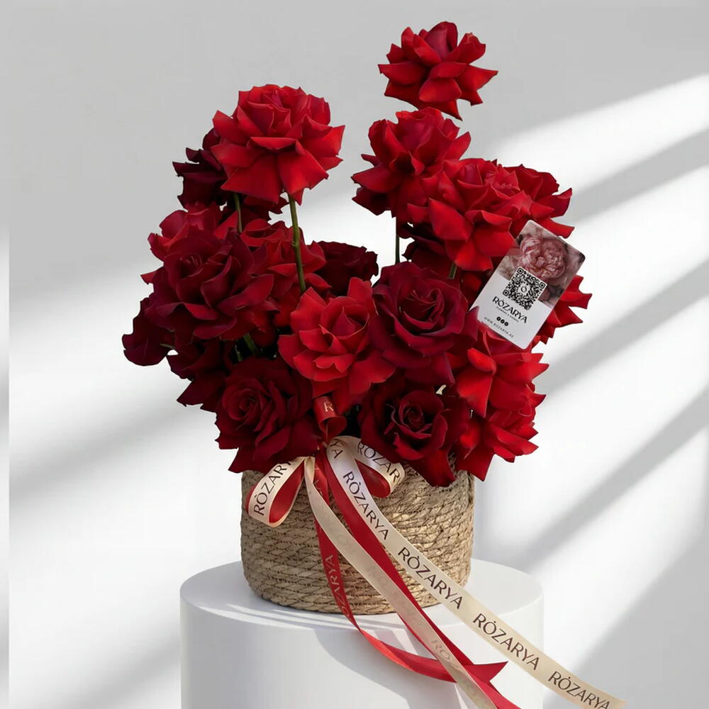 A stunning architectural arrangement of deep red garden roses with hand-reflexed petals for maximum volume. Presented in a natural woven seagrass basket, blending rustic textures with high-end floral artistry. Finished with double-layered ROZARYA branded ribbons for a signature luxury touch. • Please Note: As flowers are natural products, actual colors may vary slightly from digital images due to seasonal growth and lighting conditions. We guarantee that the overall style and premium quality as well as freshness of your arrangement will always be maintained.